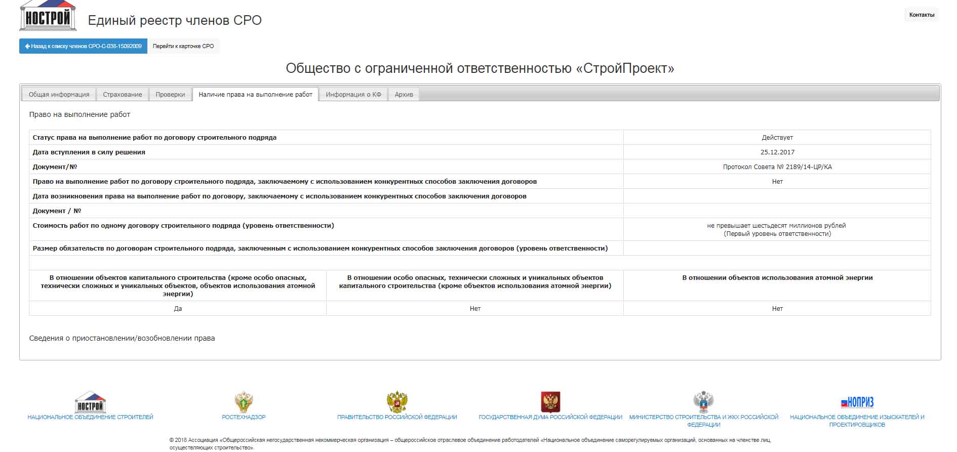 Ввиду того, что в настоящее время членство в СРО может быть прекращено в любой момент мы приводим ссылки на официальный сайт НОПРИЗ - выписку из единого реестра членов СРО.